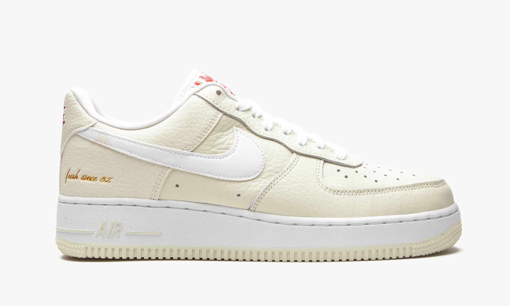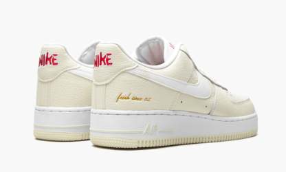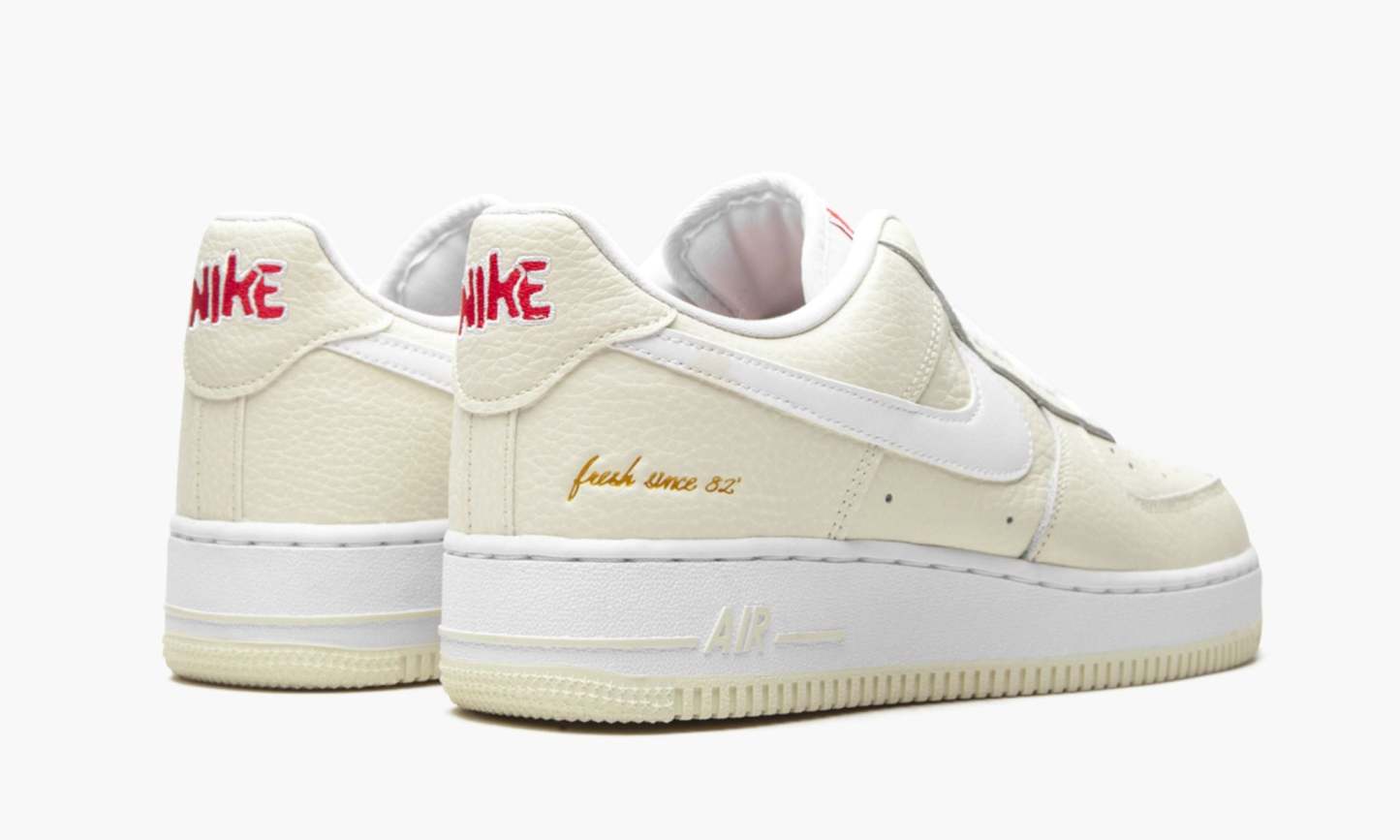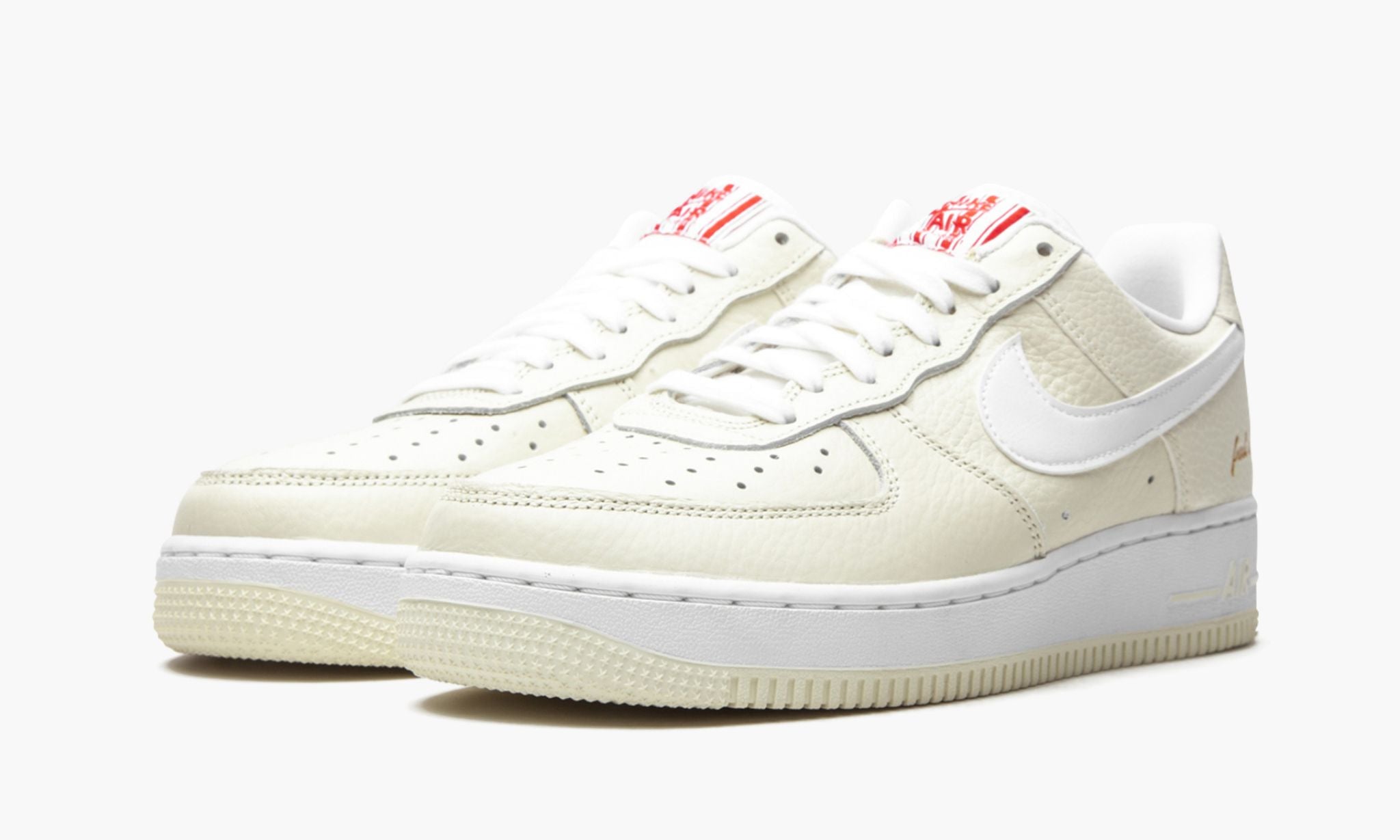 The Low “Popcorn is a March 2021 colorway of the low-top silhouette inspired by throwback movie theatre popcorn boxes. Over the years, colorways of the have been inspired by Halloween, famous New York City basketball courts and, now, food, as exemplified by the “Popcorn design. A Coconut Milk shade of buttery tumbled leather forms the base of the shoe and a white leather Swoosh is stitched onto the mid-panel. The nylon tongue tag replicates the look of two-tone red-and-white movie theatre popcorn boxes and a graphic printed on the liner reveals popped kernels. The “ embroidery on the heel mimics the “Popcorn font found on the front of the cardboard boxes. The slogan “Fresh Since is inscribed on the lateral side of the heel. Release date: March 9, 2021.